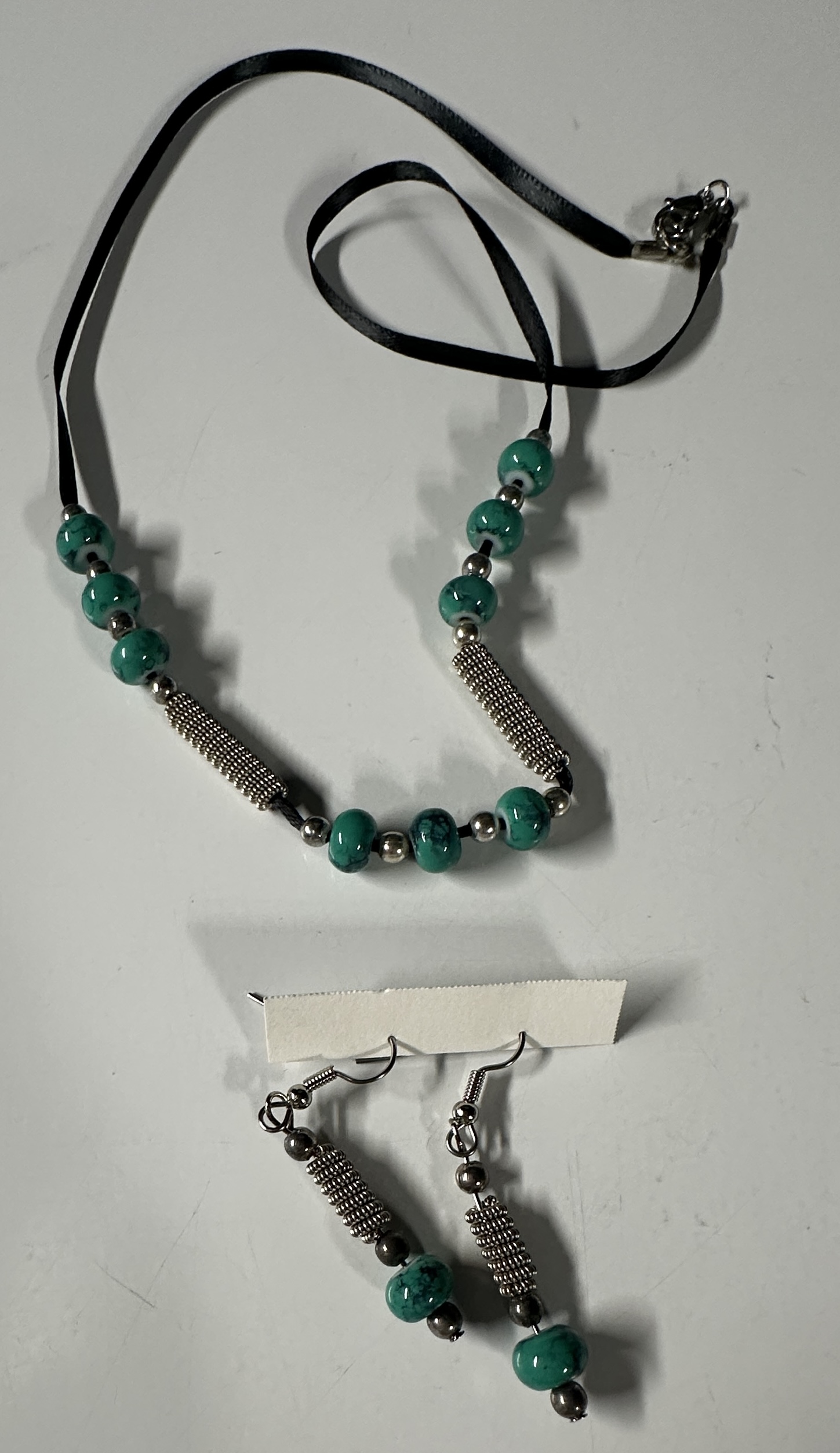 A beautiful necklace featuring guitar strings and turquoise and a pair of guitar string earrings