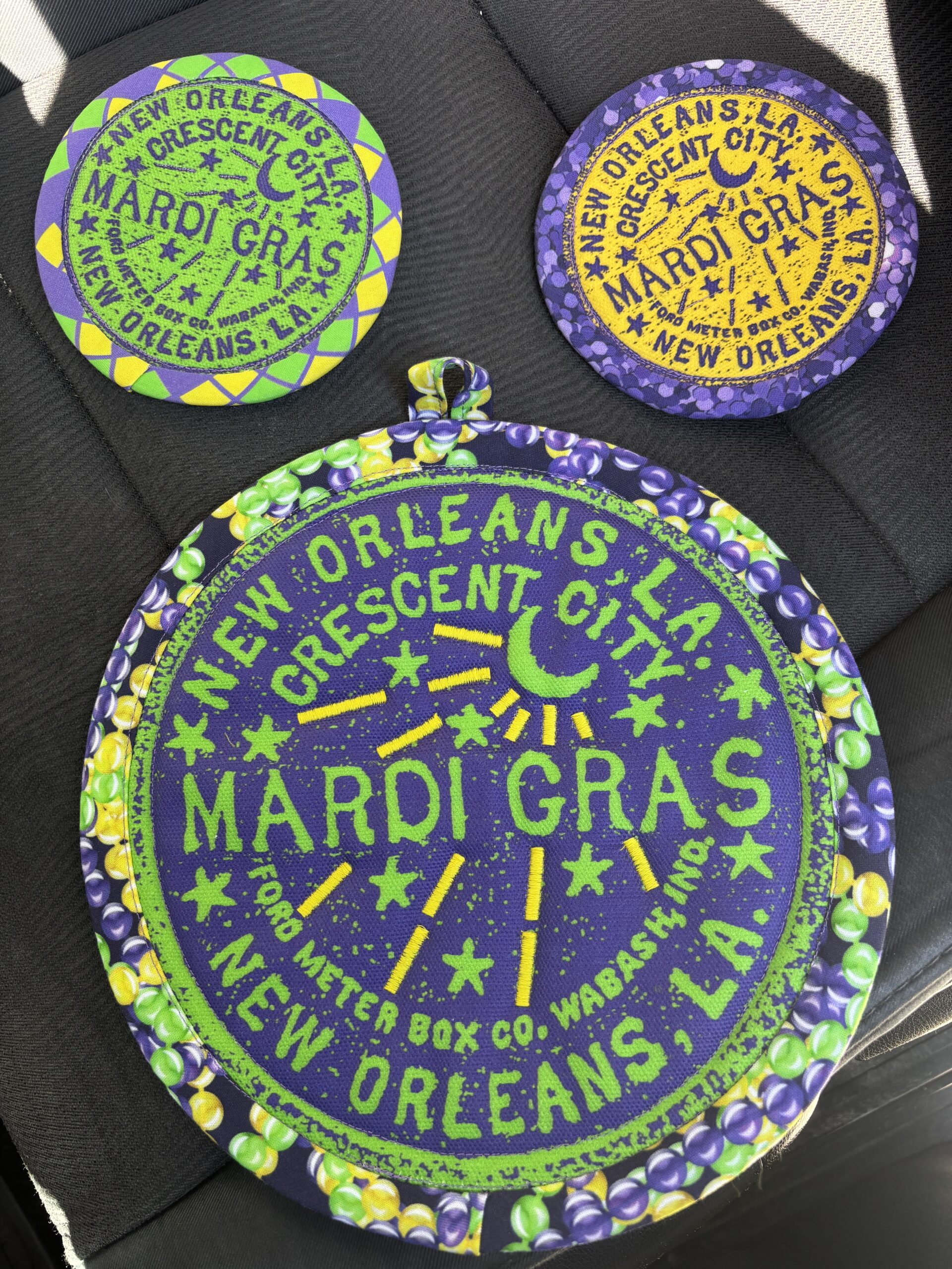 Mardi Gras colored potholder and 2 coasters from Tracy Thompson’s Kabuki Design Studio