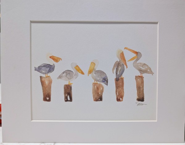 “Perched Pelicans”. Original watercolor by Stephanie Allen Stiles. Matted to 11″ x 14″.