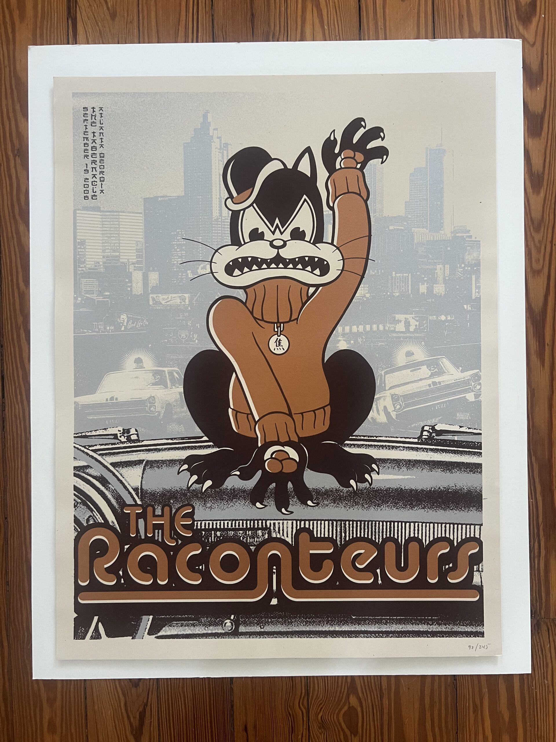 Poster from The Raconteurs show (one of Jack White’s groups) in Atlanta, GA, 2011. This has a great cat graphic, with silver (Atlanta skyline) and copper (lettering & sweater) ink. It is in excellent condition & has been stored flat. 25 1/2 x 19 1/2